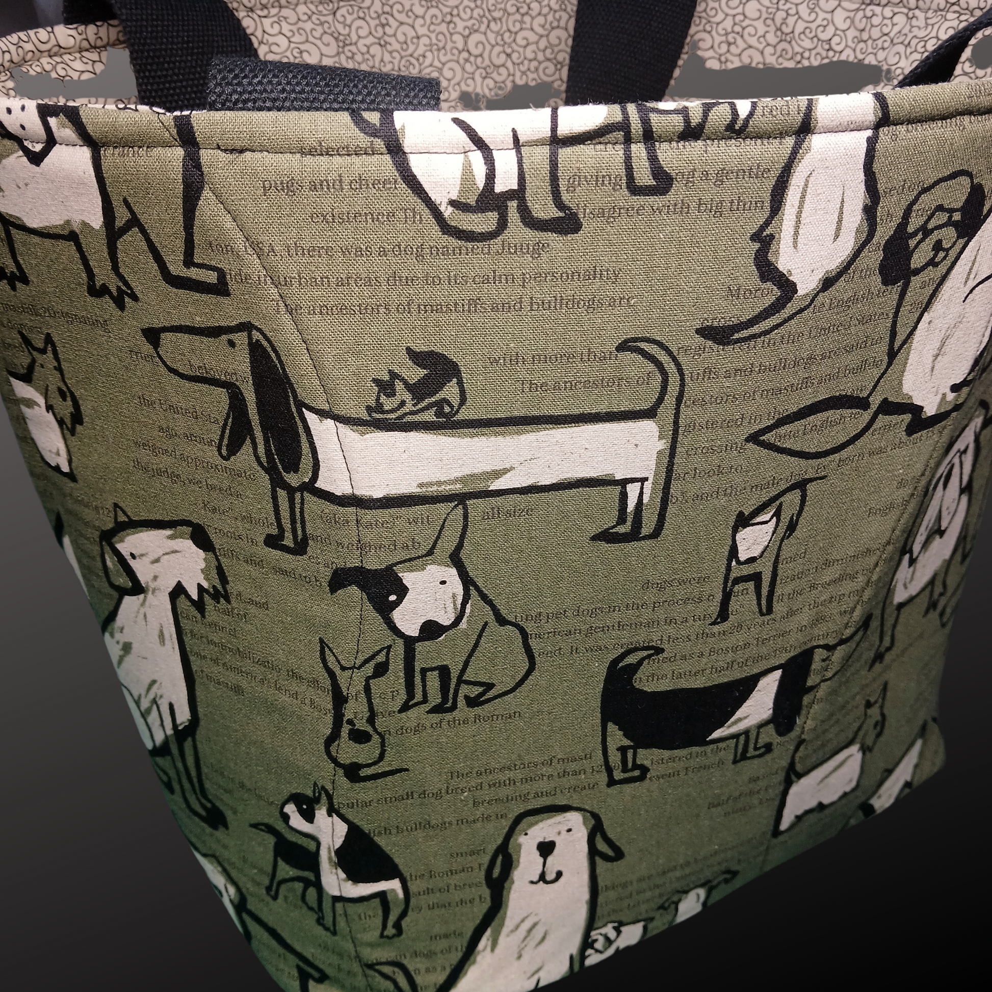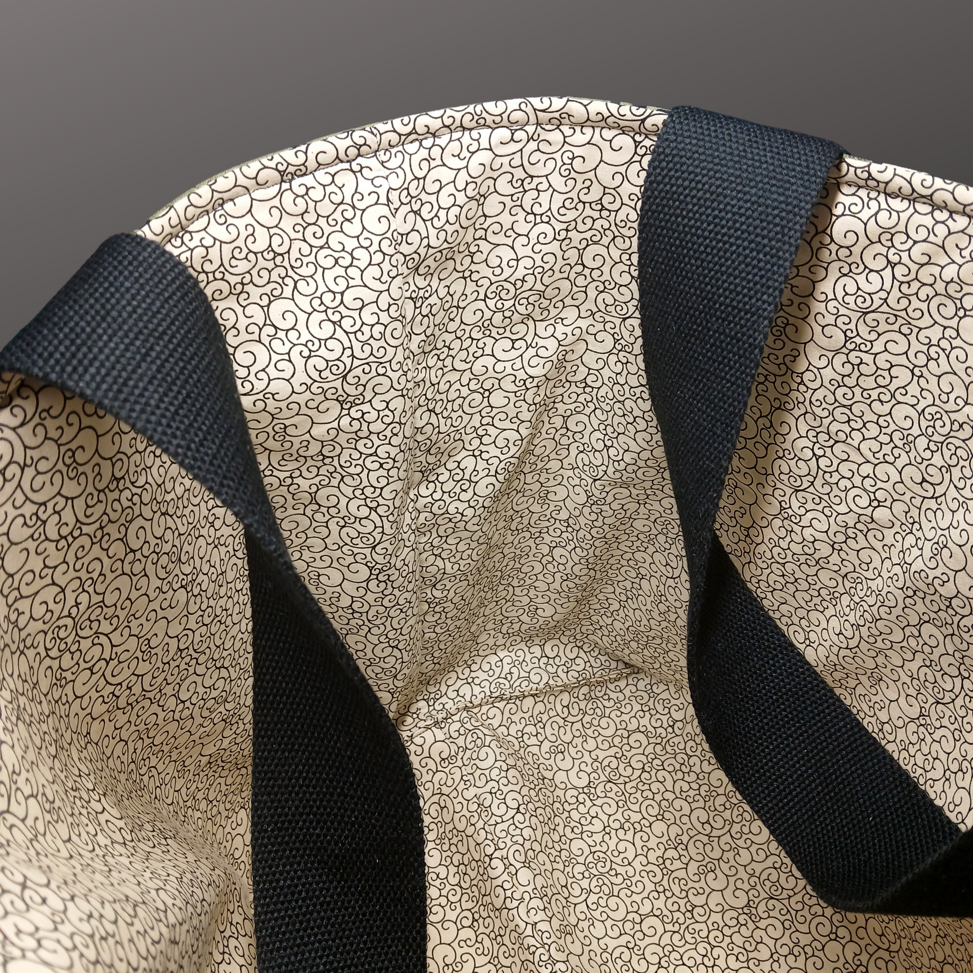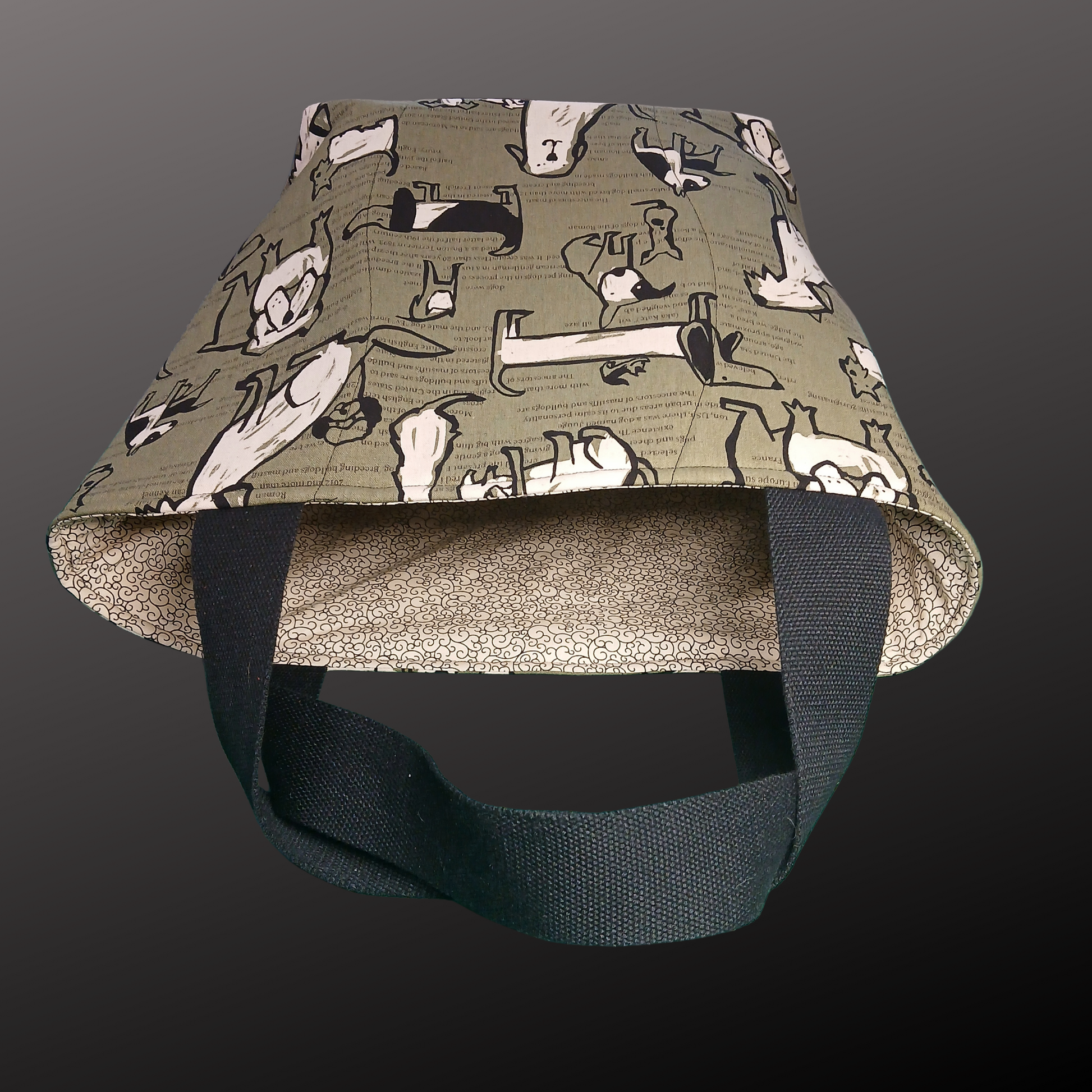 This large tote is made with foam interfacing so it's self supporting. We made this one extra large so it holds a LOT and has strong canvas webbing handles. It folds or squashes pretty flat but then springs back into shape so you can stand it on the self-check-out platform and load it easily, without it flopping over. The handles are double stitches so they're very strong! I made one for myself as a test, to make sure, and I've loaded it with canned goods, juice, frozen stuff, literally stuffed it, and said 'oof!' when I picked it up... and no handle issues whatsoever. I have been using the test one for 3 months for a lot of heavy lifting and it's still my favourite tote. Our Northern Peaks Bears tote is made the same way, just in a slightly smaller, more compact format.